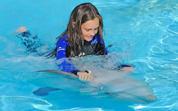 The dolphin interaction takes place at shallow depth, perfect for those who prefer not to swim.